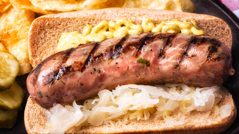 Highly involved smoked meats like brisket and ribs may be the biggest showstoppers, but it's hard to beat a brat for pure grilling joy. Packed with pungent spices and fatty, juicy pork, brats require no prep and deliver an amazing amount of flavor in a tidy package. It's also easy to customize or upgrade bratwurst with tons of different toppings, making them perfect for an easy family meal or a big backyard party. And while brats are plenty tasty boiled or pan-fired, they are all-stars on the grill. Live fire brings out the best of the cased meat, they cook up in a matter of minutes, and they're almost impossible to mess up. But there are still a few best practices that can deliver the perfect grilled brats to the table, especially with the choice of where to place them on the grill. That's why Tasting Table reached out to expert Pete Fjosne, executive chef at Rhein Haus Seattle, to ask how he cooks his grilled brats.