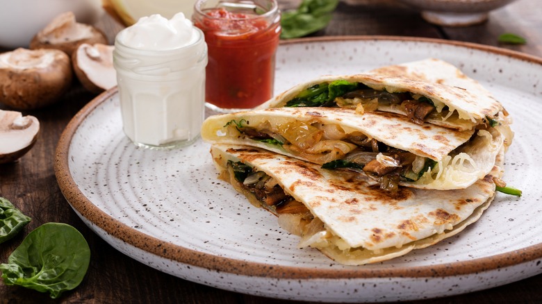 If you love a lot of cheese in your quesadillas, try combining the elements of both a Philly and a traditional Mexican quesadilla and go for a blend of Jack cheese, sharp cheddar, provolone, and even a spread of Cheez Whiz as well if you're feeling extra daring. There are a number of different store-bought tortilla brands that would make a great bread component to your Philly cheesesteak-inspired quesadillas. And if steak isn't your protein of choice, you can even try a vegetarian tempeh cheesesteak recipe with which to fill your quesadillas. However you combine the two dishes, it'll be an unforgettable meal.