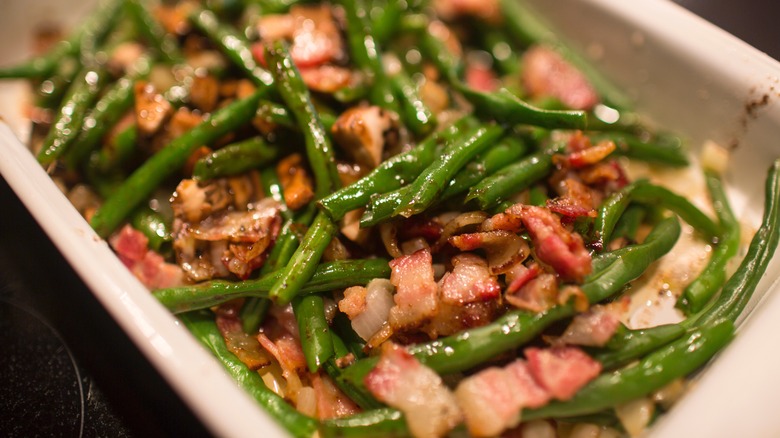 Although we've certainly moved past the loathsome feeling we once held towards green beans as kids, the canned version often takes us right back. While they're not horrible, they certainly don't hold the same delicious flavor as a classic green bean casserole made from scratch, for example. Still, these canned veggies can be completely transformed, especially when given a twist from a cuisine that knows how to make a mean side dish. To elevate your green beans with a Southern flair, add bacon and brown sugar.