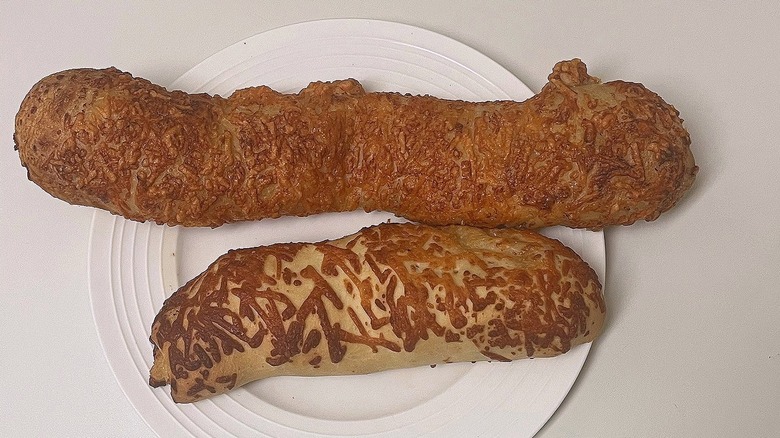 Had I tried them separately, I wouldn't have noticed the nuanced flavor and texture differences between the two bakes. But as I did, the Costco food court one is the winner. Despite following the cooking instructions, the dull dough and lack of exterior cheese greatly impacted the take-home frozen bake's overall taste, look, and texture. You can see that the cheese nearly burned while the crust barely developed any browning.