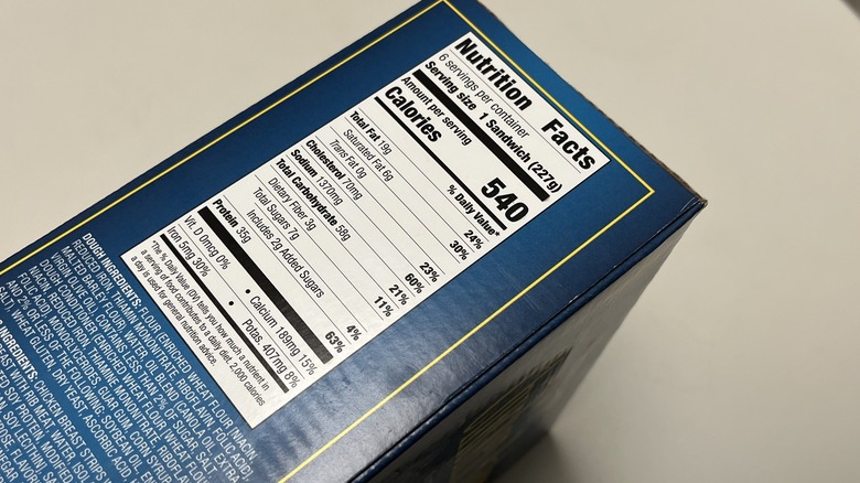 Accessing the nutritional information allows patrons to make choices based on personal dietary needs. And you'll notice a considerable nutritional difference when comparing the two chicken bakes. The boxed frozen bakes clearly show the nutritional facts label, making it easy to view the data as well as the ingredients. Each sandwich has 540 calories, 19 grams of fat, 1,370 milligrams of sodium, 58 grams of carbohydrates, and 35 grams of protein.