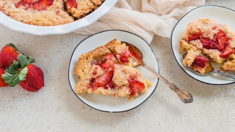Spoon cakes, by contrast, are a cross between a cake and a pudding. Unlike dump cake, spoon cake's assembly more closely resembles typical cake prep. The wet ingredients get folded into the dry ingredients, then transferred to a cake pan, smoothed, and topped with fresh fruit to bake. This difference in construction also affects these desserts' respective heights. While toothy, chewy dump cakes are all about thick stacked layers, thinner, soft spoon cakes are baked in shallower dishes. Unlike dump cakes, spoon cakes only include a standard homogeneous wet batter, which bakes more evenly around the fresh fruit when baked in a wide, shallow baking dish or cast iron skillet.