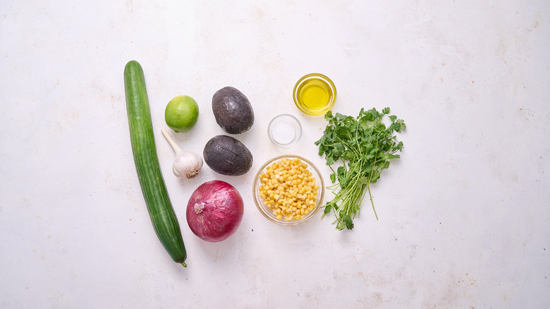 The ingredient list for this salsa is simple, and you may already have many of the ingredients in your kitchen already. You'll need a few pantry staples like olive oil and salt. From there, it's all produce: You'll need red onion, garlic, lime, avocado, cilantro, corn, and cucumber. You can use any cucumber here, but we recommend seedless or even Persian, which are less watery than the full-size cukes. As for the corn, you can use fresh sweet corn or simply pick up a can of kernels.