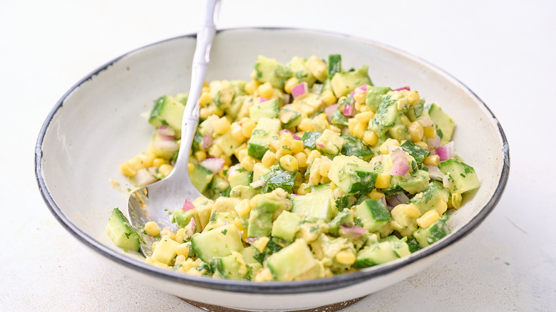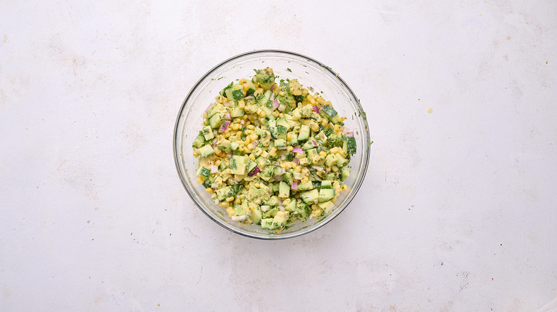 - Add the cucumber, avocado, corn, onion, and cilantro and mix until well combined.
