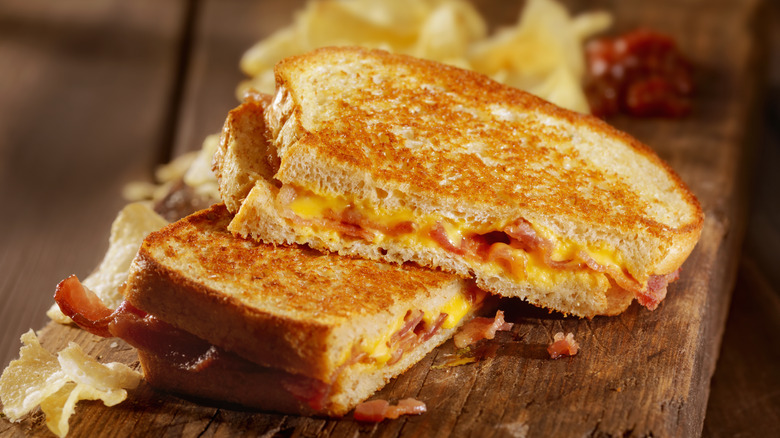 Of course, with grilled cheese, texture is just as crucial as flavor. If you're looking for a simple way to add an addictive crunch with each bite, look no further than the bag of potato chips already in your pantry. By adding crushed potato chips to your grilled cheese, you can create a crunchy exterior that perfectly complements the sandwich's soft, melty interior. Because potato chips are so neutral in flavor, they pair well with just about any type of cheese, bread, or additional filling you might add.