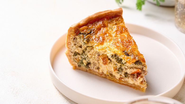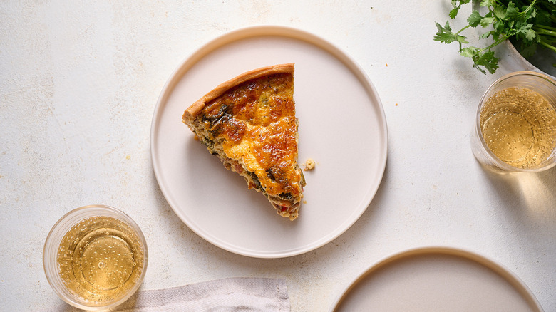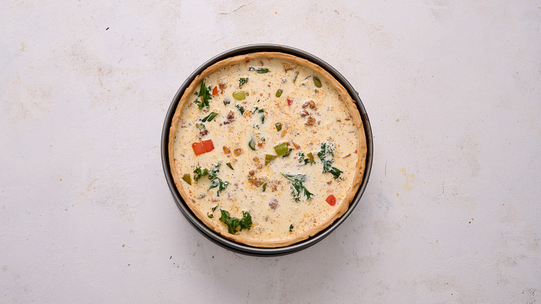 Blind baking, par-baking, and pre-baking are all terms associated with pie and quiche crusts. While mostly interchangeable, there is a small difference between each, and it has to do with how long you cook the crust. A blind baked crust is baked all the way through and is ready to eat. A par or pre-baked crust, on the other hand, is only baked until the bottom is set, then filled and cooked longer with the filling inside. Usually, a blind-baked crust is used for no-bake fillings like lemon meringue, but it can be used for deep dish quiche, as well — in fact, you shouldn't skip this step, because it's one of the most crucial to a perfect, crispy quiche.