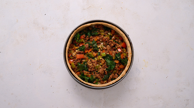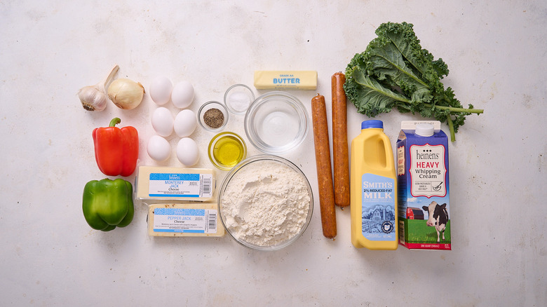 For the crust, you'll just need flour, salt, and butter. For the filling, you'll need to saute vegetables, so you will first need oil. The vegetables you'll need to grab include garlic, onion, kale, and two bell peppers. We opted for red and green, but you can choose any bell peppers that you prefer. From there, you'll need Mexican chorizo, which is sold in links and crumbles like ground beef (unlike Spanish chorizo, which is cured and is eaten in slices). The rest of the ingredients make up the eggy custard part of the filling: You'll need eggs, whole milk, heavy whipping cream, salt, pepper, and both Monterey jack and pepper jack cheeses.