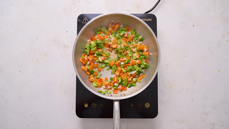 - Add the onion and bell peppers and saute until softened, about 5 minutes.