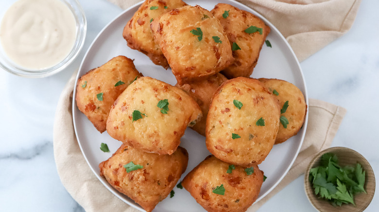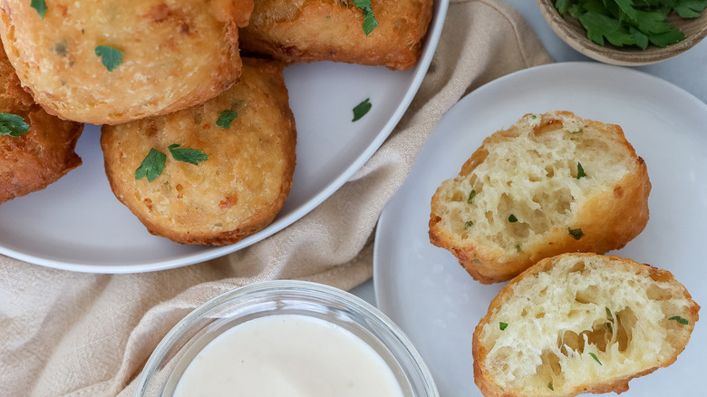 Morone has previously shared a recipe for New Orleans beignets with Tasting Table, and this savory beignet recipe starts out in much the same way, only the dough calls for a smaller amount of sweetener. It's also flavored with herbs and cheese, making the pastries so flavorful that you can eat them on their own as a snack or appetizer. They also go great with a side of sauce, though — Morone likes to accompany her beignets with a garlicky aioli dip, while you could also opt for marinara, ranch dressing, honey mustard, fire-roasted salsa, or a classic basil-pine nut pesto.