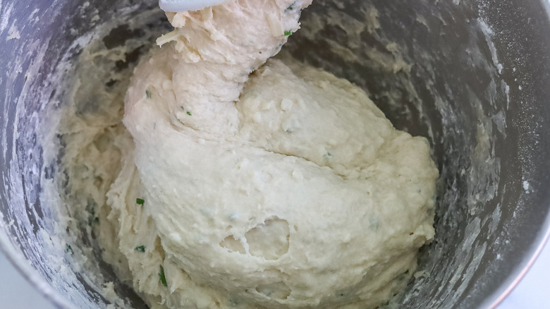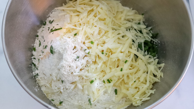 - Add the yeast, sugar, salt, flour, parsley, chives, garlic powder, onion powder, and gruyere to the bowl of a stand mixer with the dough hook attachment.