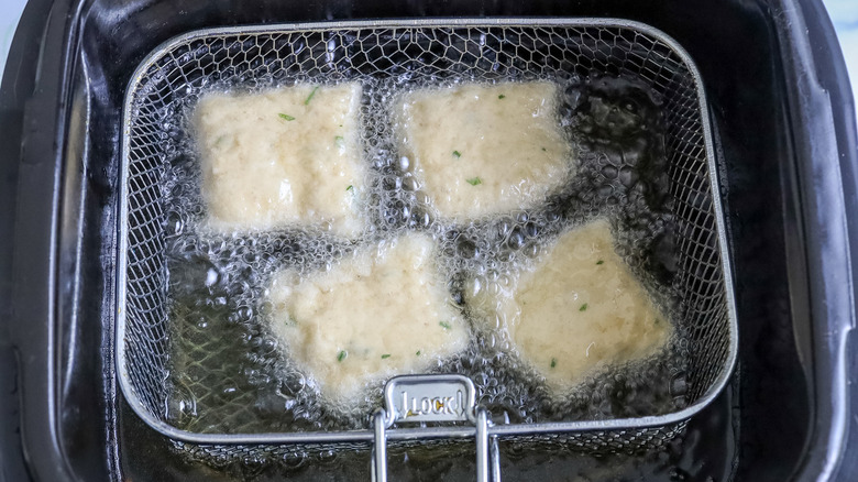 If you'll be using your oven to bake the beignets, allow them to rise for an additional 45 minutes after you cut them into squares. That way, the yeast can help them puff up in lieu of the hot oil. Preheat the oven to 350 F, brush the beignets with a beaten egg, then bake them for 12 to 15 minutes until they're golden brown. If you'd prefer to convection-cook them in an air fryer, you'll need to work in batches, since you might only be able to fit four at a time in the basket. Brush the beignets with melted butter, cook them for 6 minutes at 375 F, then take them out of the air fryer and repeat the process four more times until all the beignets are done. These beignets might have a more bread-like consistency than their deep-fried counterparts, but they'll still be delightfully cheesy (and herby).