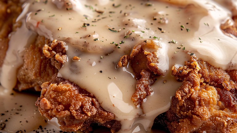 We can't talk about diner food without mentioning the infamous-ish chicken fried steak. Although some people may think of it as a dinner item, it's more common to see chicken fried steak served as a breakfast food, served alongside popular items like hash and eggs. Chicken fried steak is similar to classic schnitzel because both dishes encase a thin piece of meat around the crispy, salty, and flavorful batter. This process helps lock in the moisture and adds a unique textural component to the protein.