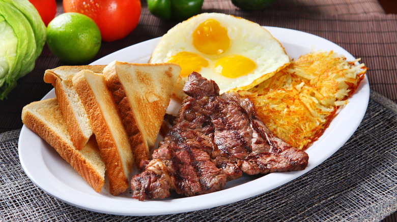 As a concept, steak and eggs seems a bit silly. Isn't there enough protein and savory flavor in eggs, hash browns, and a side of buttered toast to satisfy you throughout the day? Apparently not.