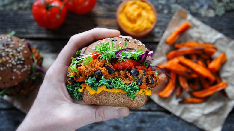 Just because vegans don't eat beef doesn't mean they can't enjoy a satisfying burger. Despite revolutionary brands like Impossible and Beyond that mimic the taste of their carnivorous counterparts, black bean burgers are the original plant-based options that don't try to be anything else. They're earthy with a hint of umami from soy sauce and expanded with savory, spicy seasonings like cumin, paprika, cayenne, garlic, and onions. If you're wondering what to pair with the aromatic profile of a black bean burger, we've consulted an expert on vegan cooking to supply you with satisfying ideas.