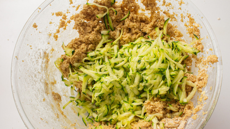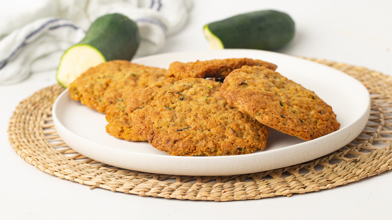 Zucchini is a very easy ingredient to add, simply by mixing the grated shards into the rest of the cookie dough ingredients. Some bits of zucchini will be visible in the finished cookie, but they won't actually add much flavor. That's a good thing, especially when it comes to picky kids, because there's a good bit of nutrition here. Fiber, folate, magnesium, potassium, and vitamin C all show up in noticeable amounts of cooked zucchini. Forget about the children — this is comforting information for when you accidentally eat a whole tray of them during a cozy couch session in front of the television.