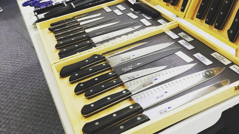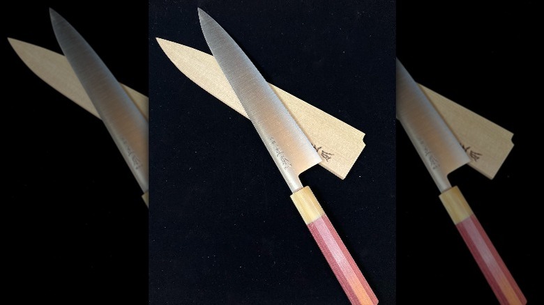 Korin offers various steel blades, including Damascus and hammered Damascus, that feature layers of steel with a hardness scale of 60 to 61 — which, as mentioned, is a good hard steel and quality that chefs look for, according to Michael Behn. These knives have a 50:50 double-beveled edge ratio, making them a suitable choice for left- and right-handed cooks. But there's also an 80:20 beveled edge ratio knife with a hardness scale of 58 available. Handle designs include a colorful mahogany, burgundy wood, and Micarta, which is a durable material made from synthetics.