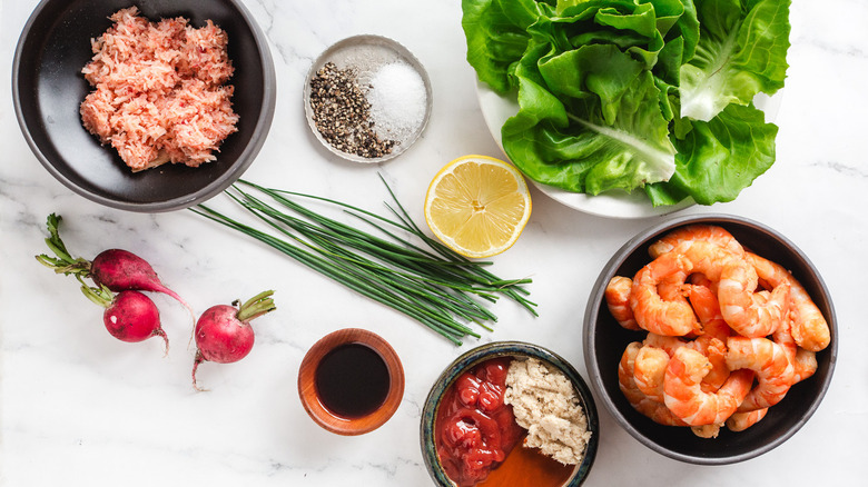 To make these fresh-tasting shrimp and crab cocktail lettuce wraps, you will need to stock up on some fresh ingredients, as well as some pantry items. For the crab and shrimp filling itself, you will need cooked crab meat and cooked shrimp meat. Both can be found frozen in many supermarkets, as well as fresh at the fishmonger's. You will also want some fresh lemon juice and some fresh chives, to add zestiness and a touch of allium flavor. For the spicy cocktail sauce, you will need ketchup, prepared horseradish, Worcestershire sauce, Tabasco or other vinegar-based hot sauce, and more lemon juice. Finally, to serve the wraps, you will need fresh sliced radishes and a head of Boston lettuce with the leaves separated (you can also use bibb lettuce for this).