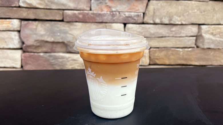 The iced macchiato at Starbucks has two shots of espresso and whole milk. The cup has a lid with a small opening, so you don't get a straw. As you tilt it to take a sip, you'll drink the espresso first, then the milkier portion. It has a brown top layer, then fades into white. This drink is icy and refreshing. Some black specks were at the bottom, but I couldn't determine if they were espresso specks or vanilla. Considering I didn't order vanilla, I'm leaning toward coffee bits. It didn't impact the flavor but was noticeable to the eye.