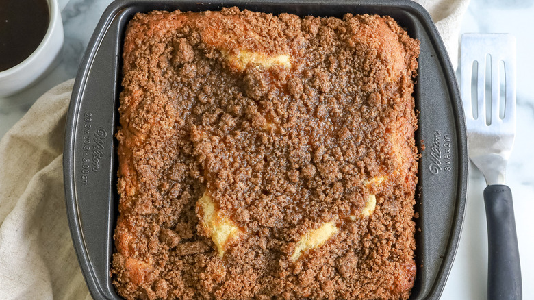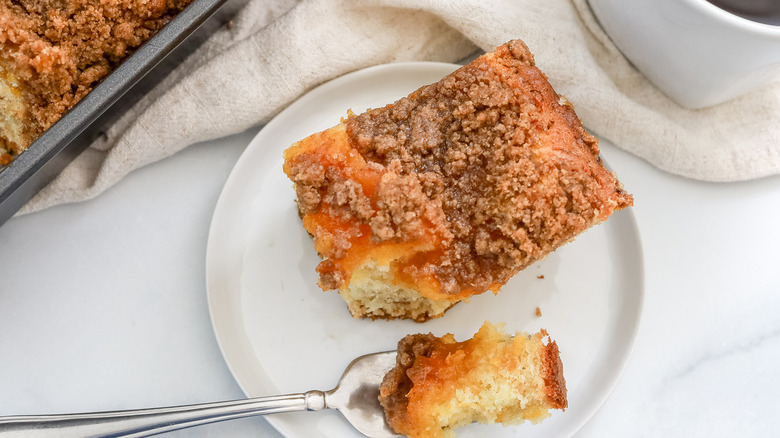 As this is a coffee cake, the name gives you a not-so-subtle hint as to the perfect pairing: Coffee cakes aren't made with coffee, but are meant to be served alongside this beverage as a breakfast, snack, or dessert. Non-coffee drinkers needn't miss out, though, as this cake would go equally well with tea. If you're thinking of serving it at a tea party, you could even look for an apricot-flavored tea to complement its flavor. The cake can be topped with whipped cream if you wish, or you can accompany it with fresh berries or a simple fruit salad.