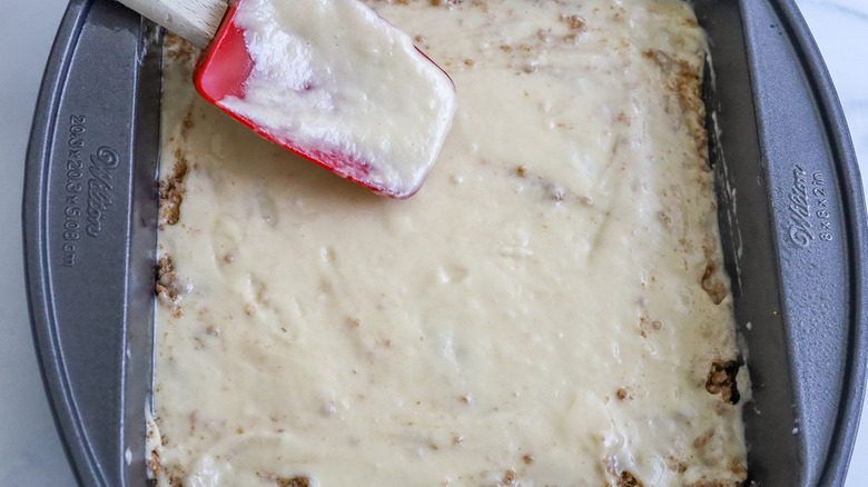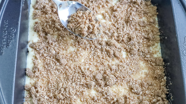 - Spoon the remaining half of the cake batter over the crumble topping and gently spread it over the topping.