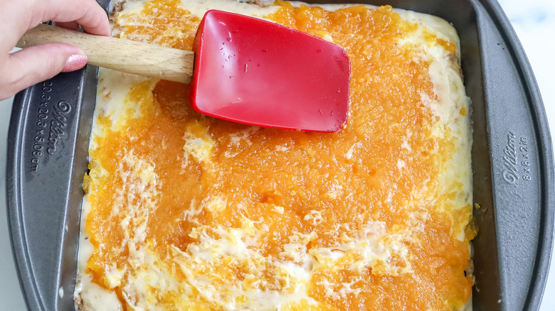 - Spoon the apricot filling over the batter and gently spread it evenly to cover the batter.