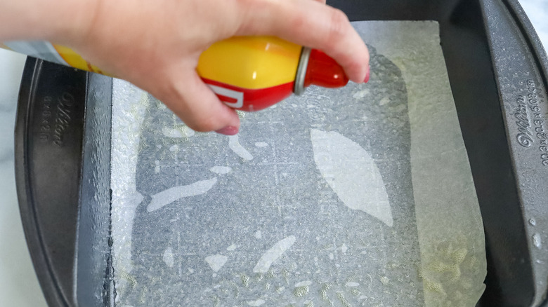 - Grease an 8-inch square baking pan, line the bottom of the pan with parchment paper, and grease the parchment for easier removal of the cake from the pan.