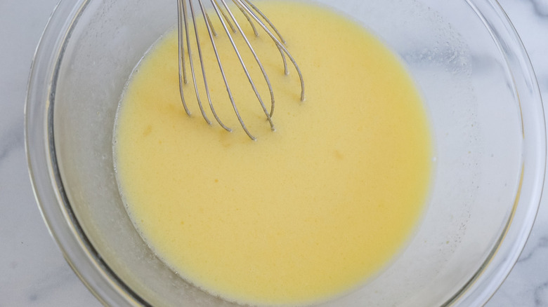 - In a separate large bowl whisk together the eggs, buttermilk, sugar, and oil until smooth.