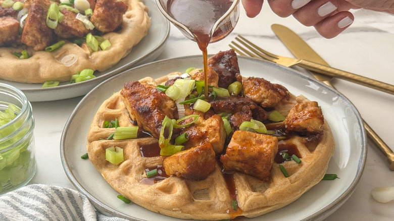 - Top the waffles with tofu pieces and chopped green onions and drizzle them with the sriracha syrup.