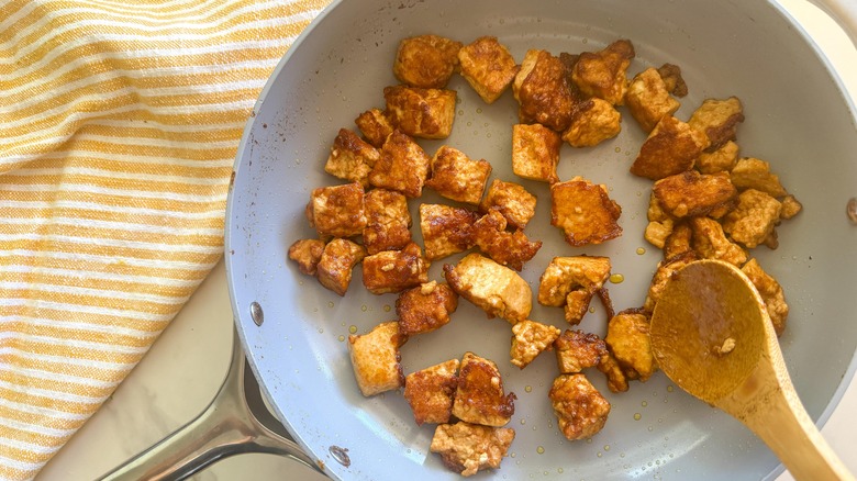 - Drop in the tofu and cook for about 10 minutes stirring occasionally until the tofu has browned.