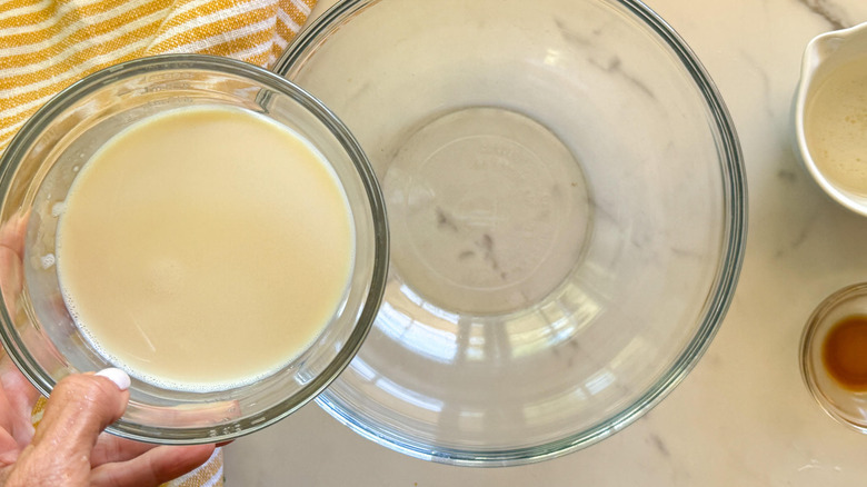 - In a small bowl combine the soy milk, coconut oil, and vanilla extract.