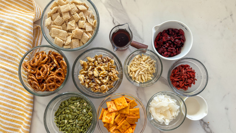 Gather the ingredients for maple-roasted snack mix