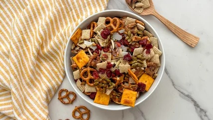 Whether it's game day, movie night, or road trip time, a good all-purpose snack mix is mandatory, and this maple-roasted snack mix delivers a sweet and salty crunch that is so satisfying. We've combined a variety of nuts, seeds, pretzels, Rice Chex, and cheese crackers for the salty, and dried fruit and coconut for the sweet. The special touch, which takes this recipe to the next level, is roasting the salty ingredients with maple syrup, so they caramelize as they toast.