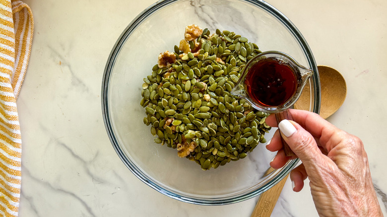 - Combine the pumpkin seeds, walnuts, and maple syrup in a bowl.