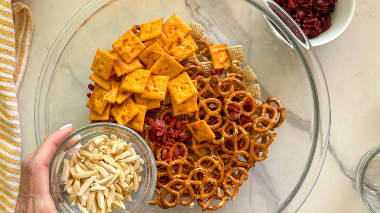 - Combine the Chex cereal, mini pretzels, cheese crackers, almonds, coconut, dried cranberries, and goji berries in a large bowl.