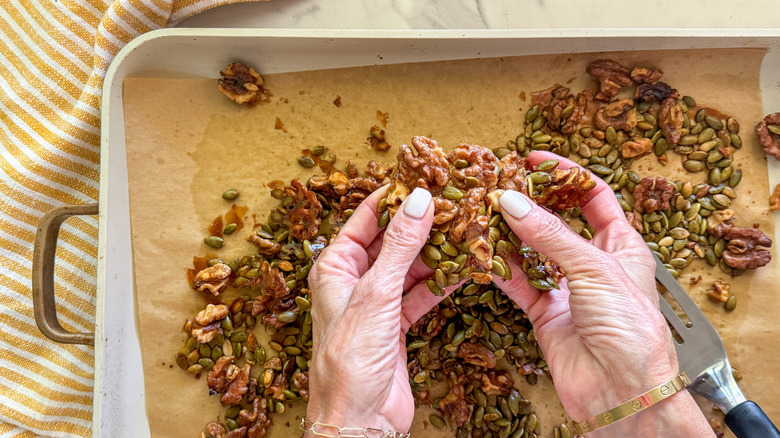 - Once out of the oven, let the pumpkin seed/walnut mixture cool for 15 minutes before breaking the clusters apart into small pieces.