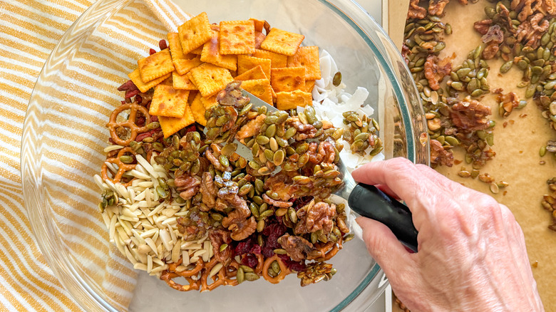 The snack mix is ready to serve or store.