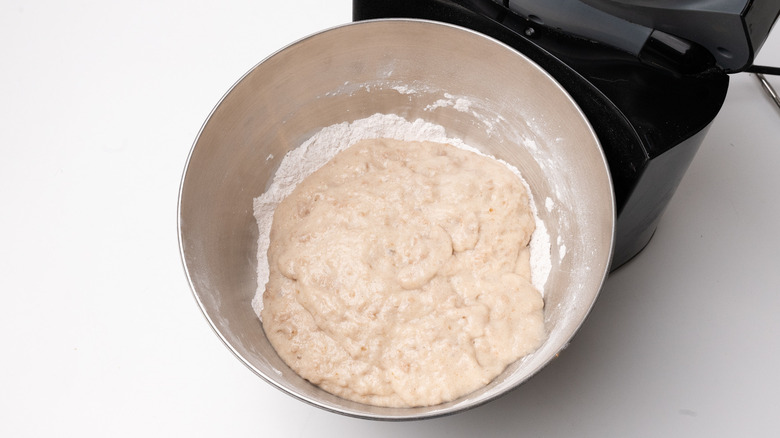 Once the psyllium husk and yeast mixture has formed a gel-like consistency, combine it with the flour mixture in a stand mixer.