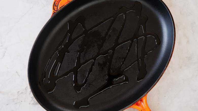 - Heat the oil in a large cast iron pan over high heat until smoking.