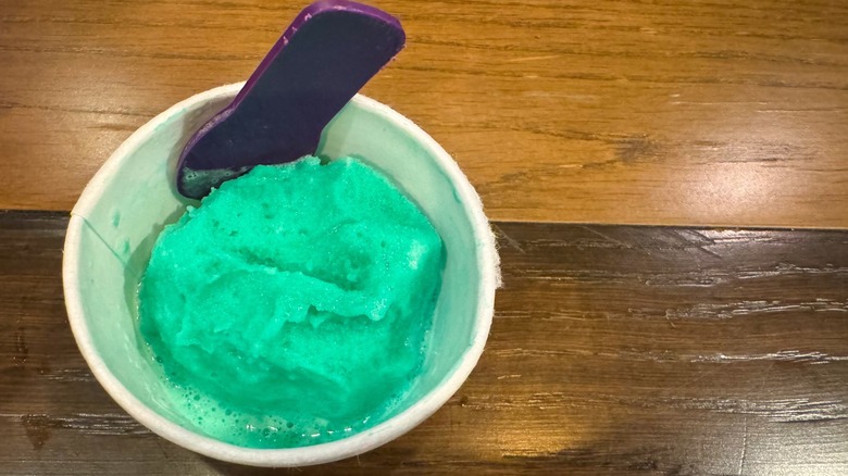 Unfortunately, for vegans and people who want to avoid dairy, milk is on the ingredients list. I was shocked, given the complete lack of creaminess, but it is nonfat milk, so it's not that surprising. The calorie and sodium content are both low, clocking in at 70 calories and 10 grams of sodium per serving, and the sugar content (14 grams per serving) is fairly light as well for just about 3½-ounces of dessert. The flavoring syrup is caffeine-free, so no need to worry that indulging in this treat will keep you up at night, but it does include numerous blue and yellow food colorings, assorted gum binders, and corn syrup solids.