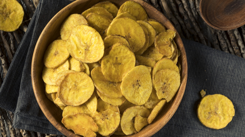 Enter plantain chips, which are particularly beloved in Central American, South American, and Caribbean cuisine. They're a simple replacement for their potato counterparts, as you can buy them in bags from the grocery store (although you can also whip them up from scratch at home). Plantain chips are — as their name suggests — made from plantains, fruits similar to bananas but with only a lightly sweet flavor. However, they boast plenty of starch, making them an excellent swap for spuds when it comes to using them for chips. When they're sliced, seasoned, and either baked or deep-fried, they produce the perfect combination of salty and sweet flavors with plenty of crunch. Because you get those additional slightly sugary notes mixing with whatever seasonings your particular chips offer, you can drag them through either savory or sweet dips.