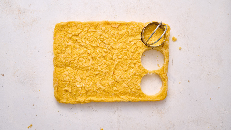 - Using a small biscuit or cookie cutter, cut the polenta into small circles.