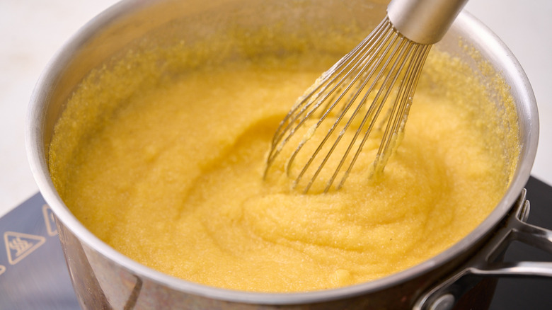 - Stir in the cornmeal slowly while whisking until all the cornmeal is incorporated.