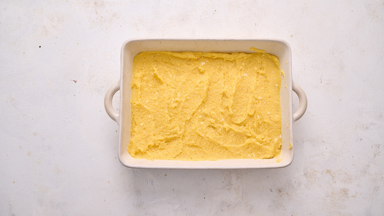 - Spread the polenta into the baking dish, creating a 1-inch layer.