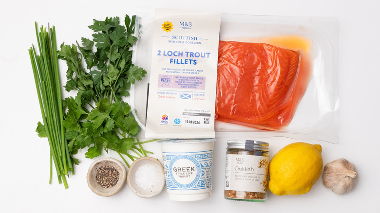 Aside from the trout fillets, you will need yogurt, a garlic clove, lemon juice, fresh chives, fresh parsley, fresh cilantro, salt, black pepper, and dukkah.