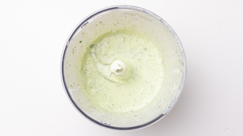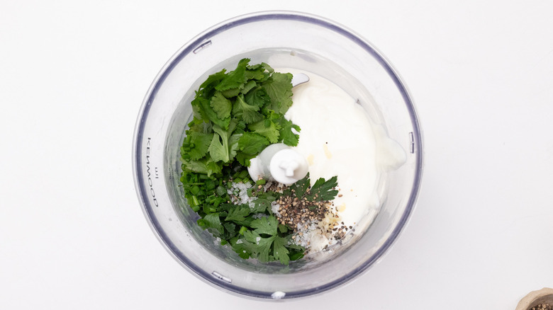 - Add the yogurt, garlic clove, lemon juice, chives, parsley, cilantro, salt, and pepper to a food processor.