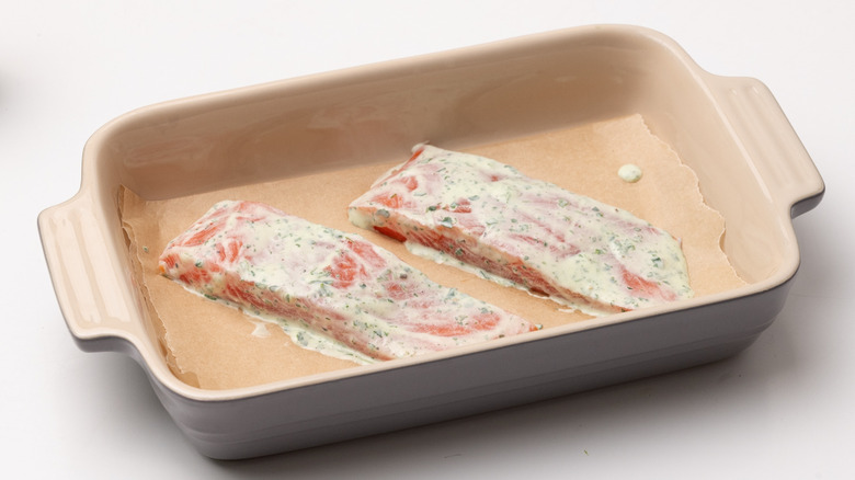 - Line a baking dish with baking paper.