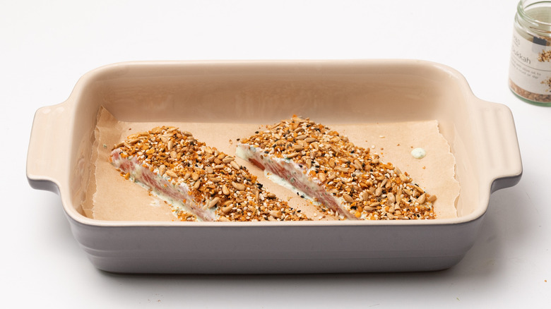 Though both yogurt and dukkah pair exceptionally well with trout, that doesn't mean that you're limited to the single type of fish when making this recipe. Trout is in fact a close relative of salmon — both are oily types of fish and share a similar slightly sweet and nutty flavor, meaning that you can easily substitute salmon filets into this recipe in place of the trout, and you'll know that it will still taste good. Salmon is very similar to trout in size and cut, so you can sub in salmon and follow the recipe exactly as-is.