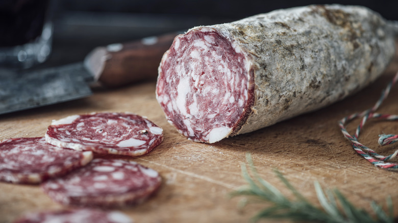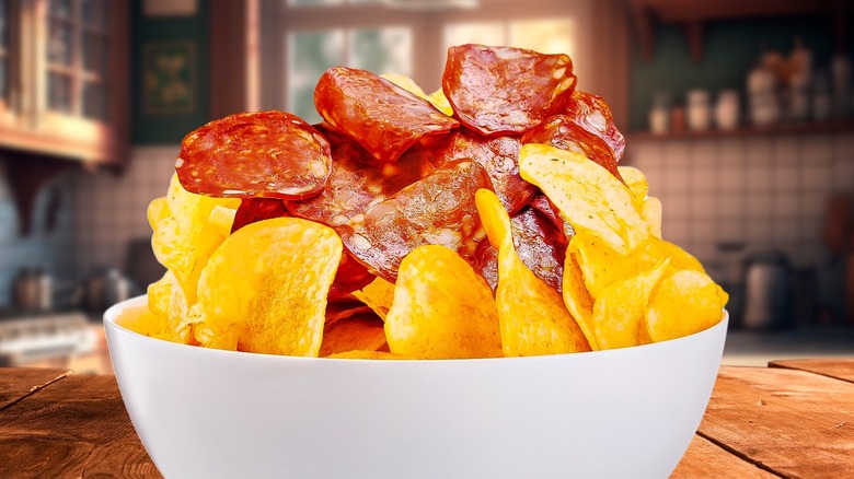 As for making your crispy chips, simply select a salami that's close in size to whatever chips you're planning on using. From there, slice thinly and use either a skillet on the stovetop, your oven's broiler, or an air fryer to get your crispy salami chips to the desired level of crunchiness. Once everything is crisped to perfection, toss it together in a large bowl and enjoy. You can even go a step further in dressing up your snack with a sprinkle of seasoning or cheese for extra spice and even more protein. However you serve it, your crispy salami and chips will amaze.