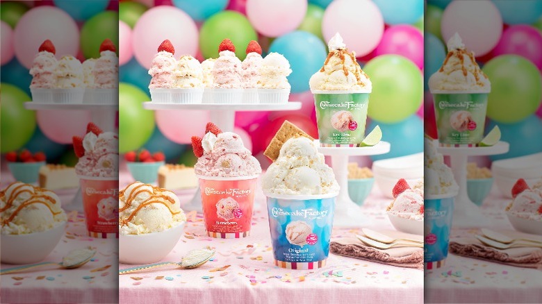 The Cheesecake Factory launched its Premium Cheesecake Ice Cream in 2020 as part of its At Home brand, and the product does indeed fuse those two advertised desserts. Hard-pack ice cream is combined with ingredients used in the restaurant's iconic cheesecakes, including a signature cream cheese blend and sour cream. The cartons also include mix-ins that vary by flavor. For instance, graham cracker swirls are available in several varieties like original, key lime, and strawberry, which also has bits of fruit. While cookies and cream, salted caramel, and birthday cake all contain nubs or swirls of their titular ingredients — the latter even has icing!
