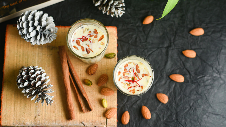 Badam milk can also absolutely be made with dairy-free alternatives, though, like whatever your go-to almond milk brand is, or any other nut milk or even soy or oat milk. You're essentially grinding almonds into a paste — and you can add different nuts to this to play with flavors, like pistachios — and then stirring that into dairy or dairy-free milk, which you'll sweeten with sugar, and season with cardamom and saffron. You can incorporate other aromatic treats like rose water, and garnish the finished milk with more spices.
